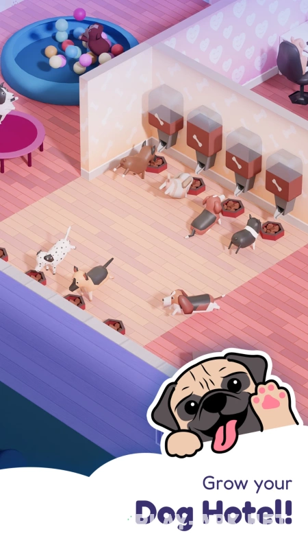 Игра начинается с того, что вы создаёте в пригороде специальный отель для собак и улучшаете его, пока он не получит рейтинг «5+». Там будут зоны для отдыха, еды игр, занятия спортом и даже для плавания. Всё как у людей!