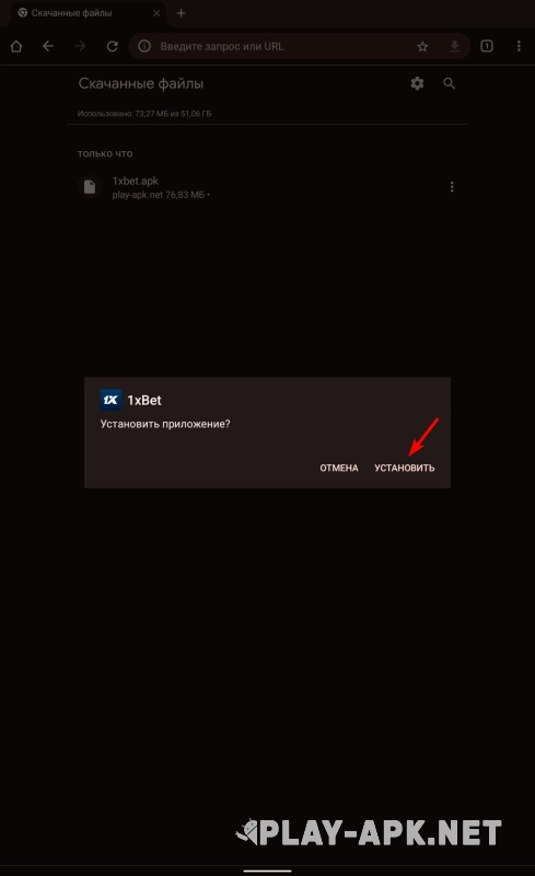После того как приложение скачается, найдите файл с названием «1xbet.apk» в файловой системе вашего устройства. Кликните по нему и нажмите «Установить», после чего начнётся инсталляция.