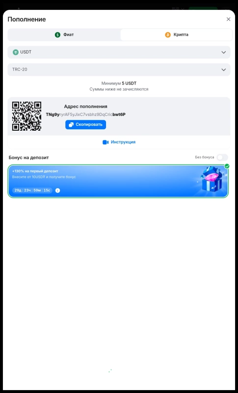 Также есть вариант использовать криптовалюту. 1win поддерживает пополнение через BTC, USDT и другие цифровые валюты. Зачисляются суммы от 5 долларов. В приложении есть подробная видеоинструкция, которую можно открыть, нажав на синюю кнопку.