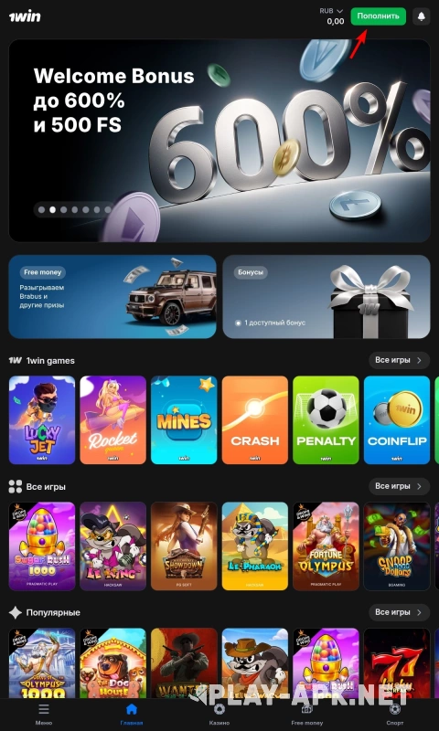 После авторизации/регистрации вы попадёте на главную страницу. Нажмите на зелёную кнопку «Пополнить», которая находится в верхней части экрана.