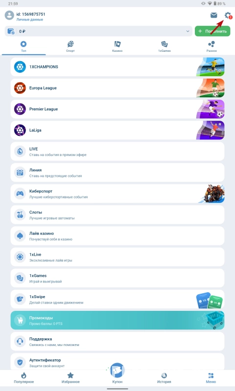 Теперь нажмите на шестерёнку, которая находится в правом верхнем углу, чтобы зайти в настройки 1xbet.