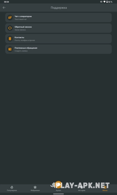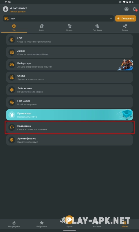 Теперь нажмите на пункт «Поддержка», чтобы открыть список способов связаться со специалистами БК мелбет.