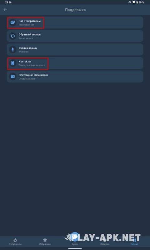В нижней части открывшегося меню будет раздел «Поддержка». Кликните по нему.