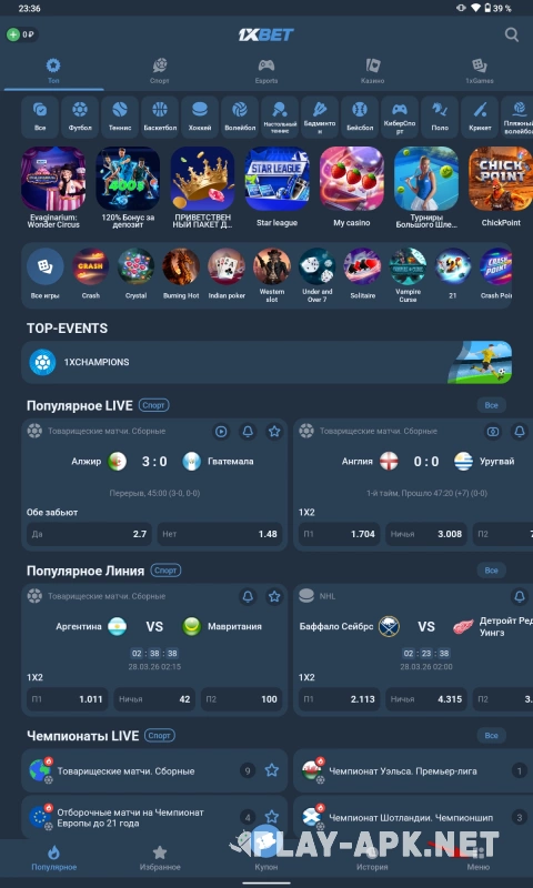На главной странице приложения 1xbet, которое можно скачать с нашего сайта, нажмите на кнопку «Меню». Она находится в правом нижнем углу.
