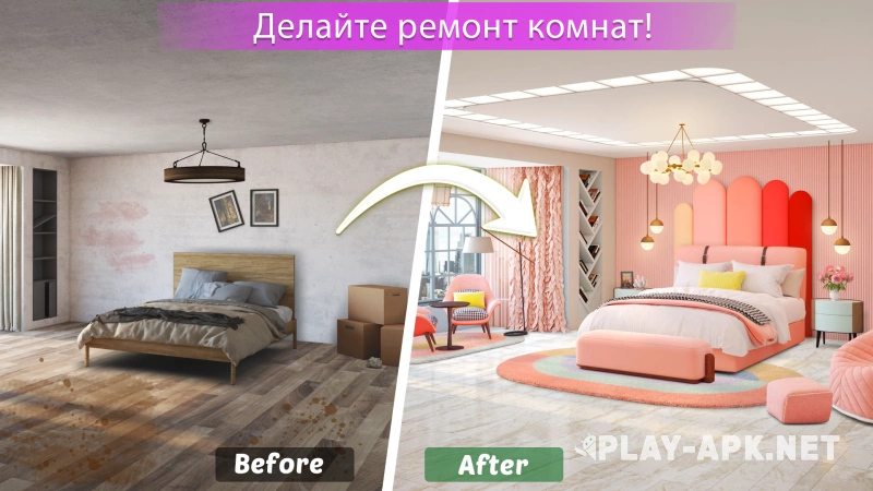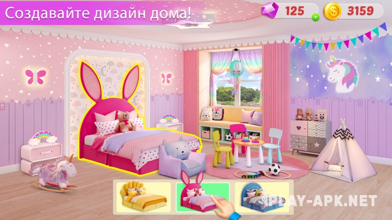 - Decorating and updating rooms by finding pairs in match-3 puzzles;