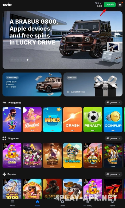 After logging in or registering, you will be taken to the main page. Click the green «Deposit» button located at the top of the screen.