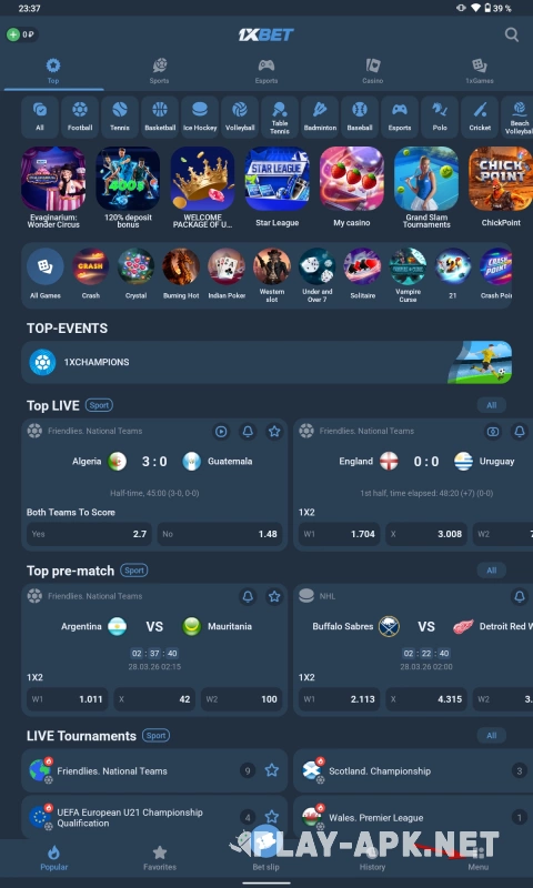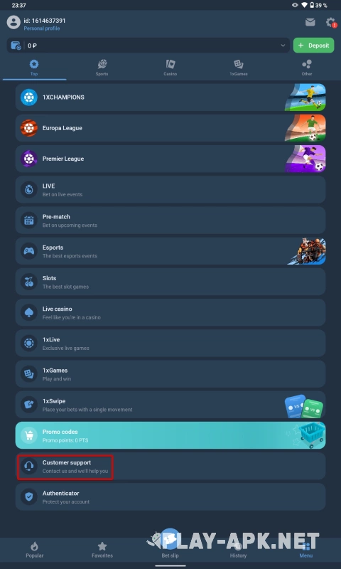 On the main page of the 1xBet app, which can be downloaded from our website, tap the «Menu» button. It is located in the bottom right corner.