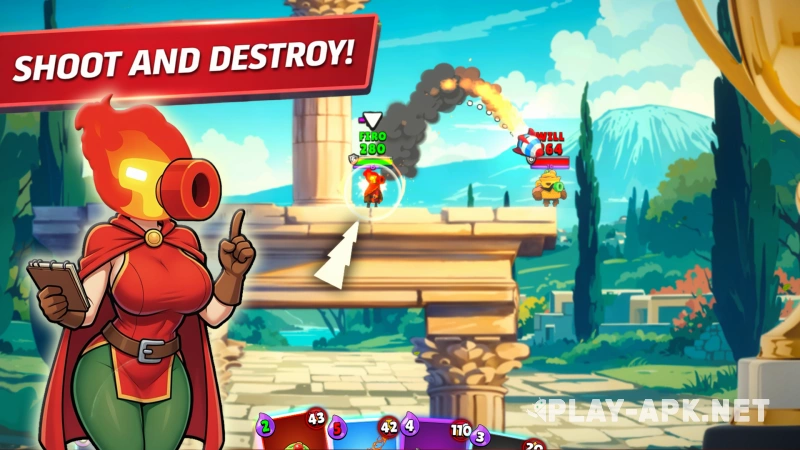 You have over thirty heroes at your disposal. Each character has a unique personality, strengths, and vulnerabilities. The shooting itself is incredibly impressive. The game allows you to use a slow-motion mechanic. You jump and manage to fire three precise shots in mid-air, destroying the landscape. Missiles and spells leave huge craters, dramatically changing the map's terrain and forcing you to change tactics on the fly.