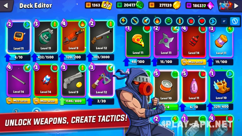 - Create a unique deck of devastating weapons for turn-based duels;